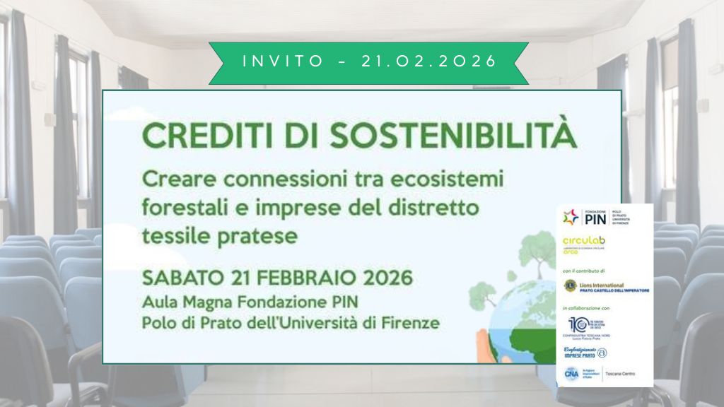 Crediti di sostenibilità: foreste e imprese tessili insieme per una transizione ecologica territoriale 📅 21 febbraio 2026📍 Aula Magna della Fondazione PIN – Prato I crediti di sostenibilità rappresentano oggi uno strumento innovativo e concreto per valorizzare i servizi ecosistemici forestali e, allo stesso tempo, offrire nuove opportunità alle imprese impegnate nei percorsi di transizione ecologica. Il convegno sarà un’occasione di confronto tra…